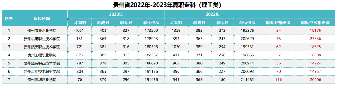 摘要: 贵州省2023年高考高职院校平行志愿投档情况已由贵州省招生考试院于2023年8月13日发布。感兴趣的朋友们可以浏览器搜索贵州省招生考试院下载查看。今年的贵州省内高职普通批录取情况简单来说就是分数暴涨!我们来看看下面几所学校的录取数据:从表里可以看出,今年贵州省高职批次录取分数线和去年相比的涨幅只能用恐怖来形容。在理工类的录取数据中,贵州盛华职业学院的录取分数......
