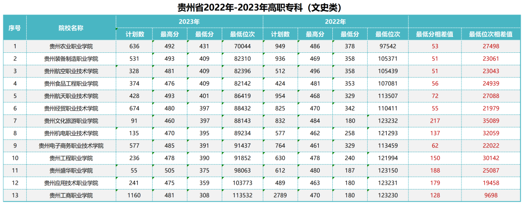 从表里可以看出,今年贵州省高职批次录取分数线和去年相比的涨幅只能用恐怖来形容。在理工类的录取数据中,贵州盛华职业学院的录取分数相比去年提高了116分,位次提高了20006位。在文史类的录取数据中,有6所贵州院校的录取分数相比去年上涨了100分以上,贵州文化旅游职业学院的录取分数更是暴涨了217分!位次也是上升了33089位。